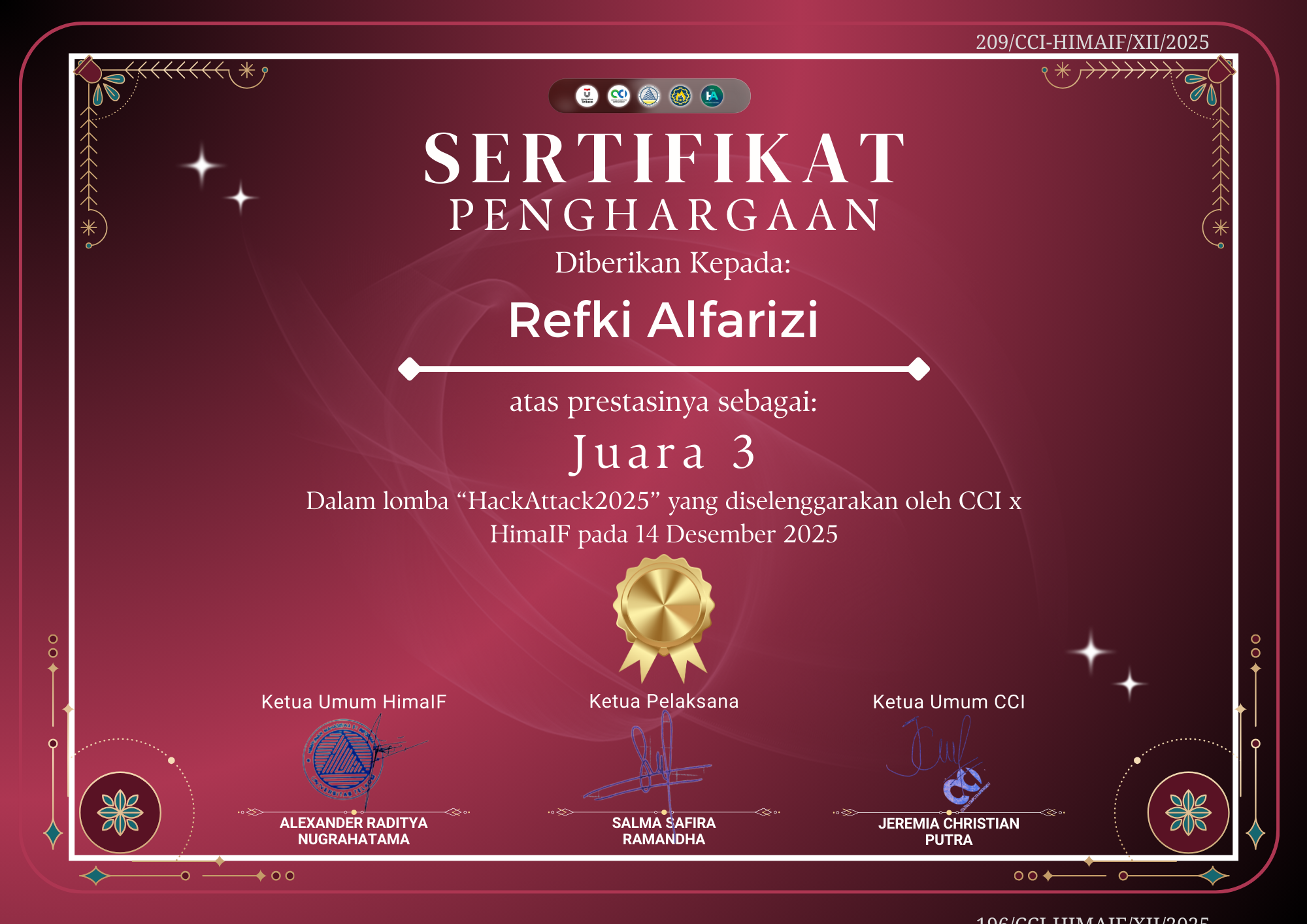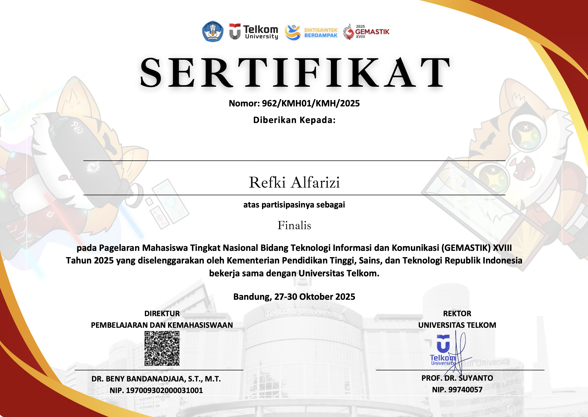 Reached the finalist stage at GEMASTIK XVIII Cyber Security, organized by the Ministry of Higher Education, Science, and Technology.