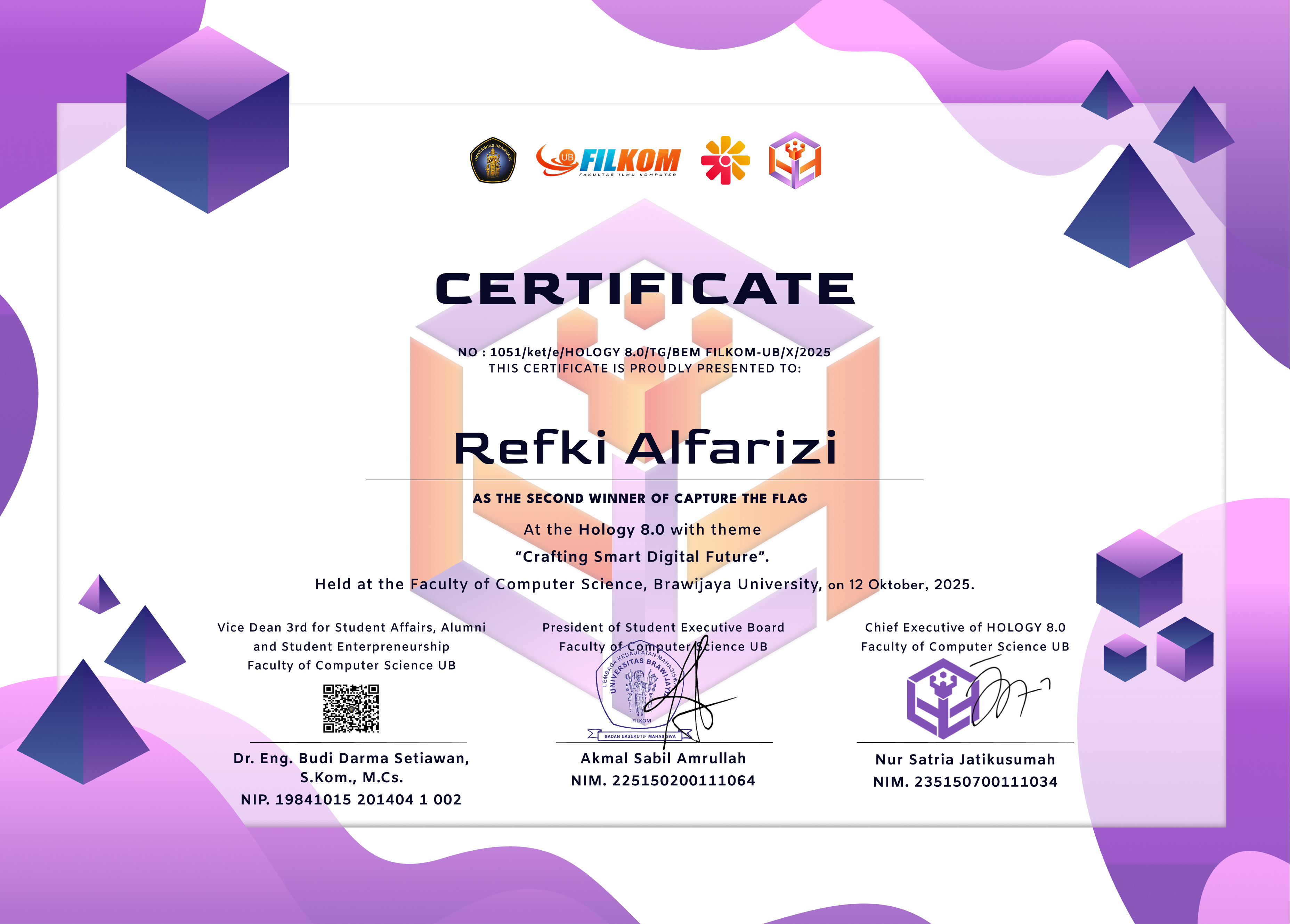 Won 2nd place in the Hology 8.0 Capture the Flag competition organized by FILKOM Universitas Brawijaya.